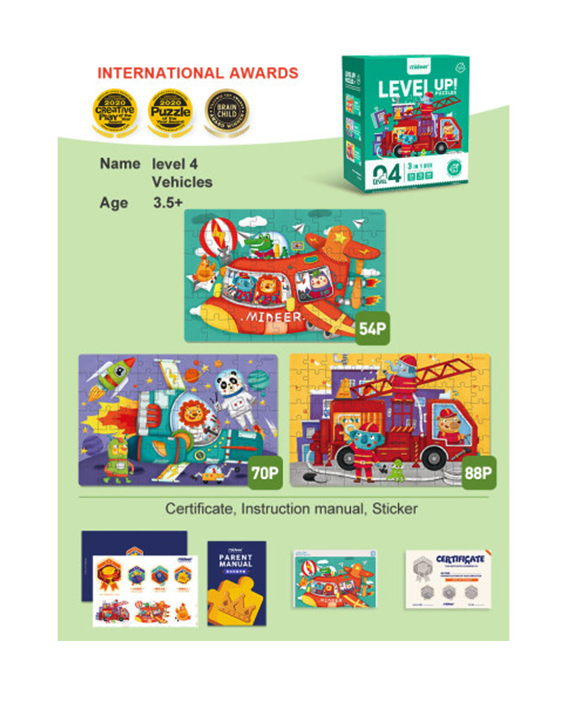Mideer παζλ της σειράς Level Up 3 σε 1 προσφέρει μοναδικά και διασκεδαστικά εκπαιδευτικά παιχνίδια. Με εντυπωσιακές εικονογραφήσεις και αυτοκόλλητα, αυτά τα παζλ προσφέρουν μια πληθώρα δραστηριοτήτων που ενθαρρύνουν την ανάπτυξη του παιδιού σας.