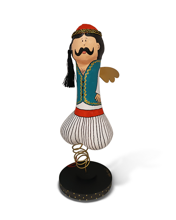 Γλυπτό 'Φαλλός-Τσολιάς' με μπλέ γιλέκο, αιωρούμενος σε ξύλινη βάση . Πρόκειται για χειροποίητη δημιουργία από papier mache  του Αναστάση Πετιμαζά. Η φαντασία παιχνιδίζει με το χιούμορ σε έναν τέλειο συνδυασμό παράδοσης και μοντέρνας αισθητικής.